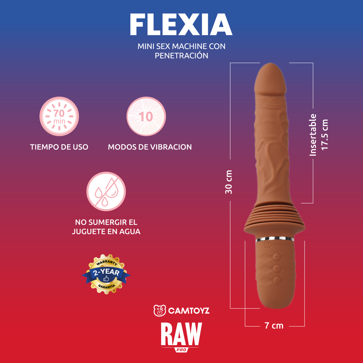 Flexia, la mini máquina sexual de la lÃnea RAW Pro de CAMTOYZ, diseñada para simular la penetración de manera realista. Su función de empuje (thrusting) de 7 cm y sus 10 modos de vibración te permiten explorar diferentes intensidades y ritmos para un placer personalizado.
